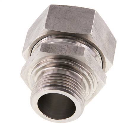 This stainless steel straight screw in connection is designed with male threads and a cutting ring fitting connection. Connection 1 has male G 1 inch threads. Connection 2 is a 35 mm cutting ring. Suitable for temperatures from -60 °C to 400 °C (-76 °F to 752 °F). Max pressure of 160 bar (2321 psi). Rated for an L (light) load class. It is made in accordance with the DIN EN ISO 8434-1 (DIN 2353).