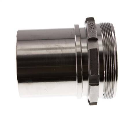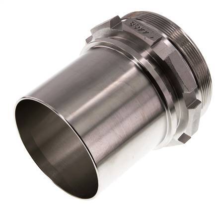 This hose screw connection is designed with a nozzle and a male thread. Connection 1 has male G 4 inch threads. Connection 2 is a hose pillar, designed for a hose with an inner diameter of 100 mm. It is a straight fitting. It is made out of stainless steel (1.4401). It is made in accordance with the EN 14420-5 (DIN 2817).