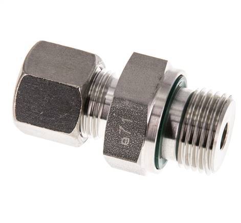This stainless steel straight screw in connection is designed with male threads and a compression ring fitting connection. Connection 1 has male G 1/2 inch threads. Connection 2 is a 10 mm compression ring. The sealing is FKM / PTFE. Suitable for temperatures from -20 °C to 200 °C (-4 °F to 392 °F). Max pressure of 630 bar (9138 psi). Rated for an S (heavy) load class. It is made in accordance with the DIN EN ISO 8434-1 (DIN 2353).