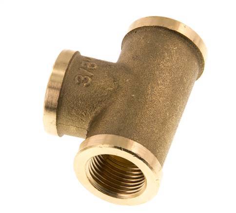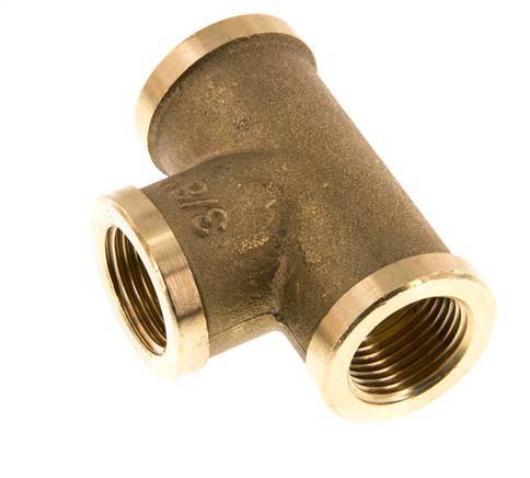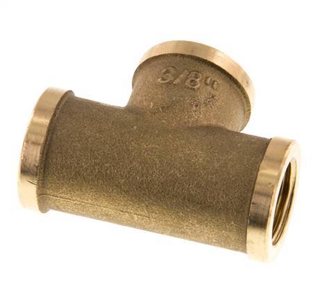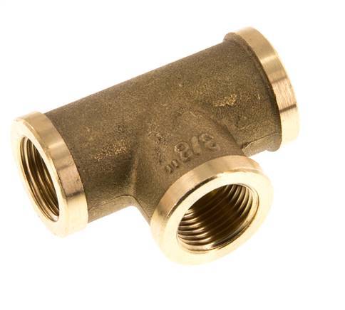 This T-piece is designed with 3 female threaded ports in a T shape. Connection 1 has female G 3/8 inch threads. Connection 2 has female G 3/8 inch threads. Connection 3 has female G 3/8 inch threads. It is made out of brass. At 20 °C (68 °F), it can handle a maximum pressure of 16 bar (232 psi).