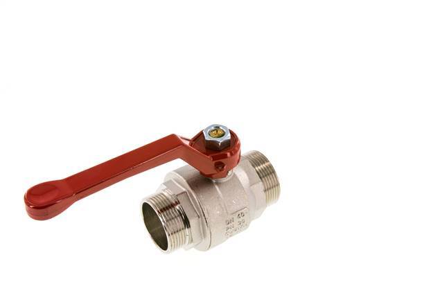 2-Way male threaded brass ball valve with G 1-1/2 inch ports and a handle for on/off flow control. 40 mm nominal diameter and a maximum pressure of 30 bar (435 psi). The valve is suitable for water (no steam), neutral, gaseous and non-aggressive, liquid media, mineral oils, fuel and compressed air, vacuum (max. -0.9 bar or -13 psi). The valve can be used within a temperature range from -10 to 95 °C (14 to 203 °F). Nickel-plated brass housing, brass ball and PTFE/NBR seals.