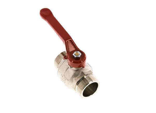 2-Way male threaded brass ball valve with G 1-1/4 inch ports and a handle for on/off flow control. 32 mm nominal diameter and a maximum pressure of 30 bar (435 psi). The valve is suitable for water (no steam), neutral, gaseous and non-aggressive, liquid media, mineral oils, fuel and compressed air, vacuum (max. -0.9 bar or -13 psi). The valve can be used within a temperature range from -10 to 95 °C (14 to 203 °F). Nickel-plated brass housing, brass ball and PTFE/NBR seals.