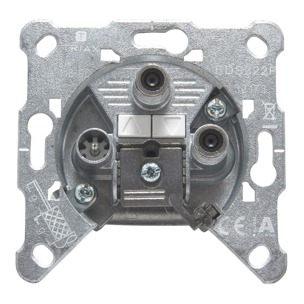 EDS 322F is a combined CATV and satellite terminal box. The upper output transmits 5-2400 MHz and can be used for satellite as well as radio and television from cable or Digitenne (DVB-T). The left output is for radio and television only; the right only for satellite. Both satellite outputs are current for powering the LNB. This wall socketis returnable for interactive services. The EDS 322F attenuates the signal by 1 dB. The EDS 322F has two inputs so the satellite outputs can operate separately.