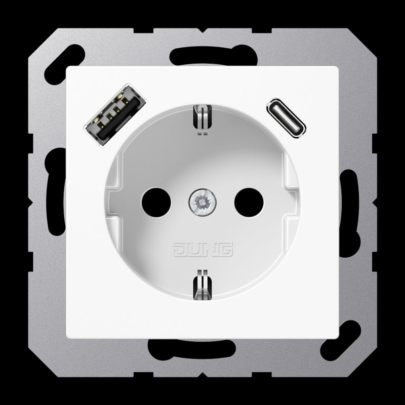 Jung socket outlet (wall socket switchmaterial), plastic, white, flush-mounted, design perimeter, degree of protection (IP) IP20, protection contact, surface finish glossy, connection type plug-in terminal, with built-in USB power supply, 1 unit, with increased touch protection, round earth contact.