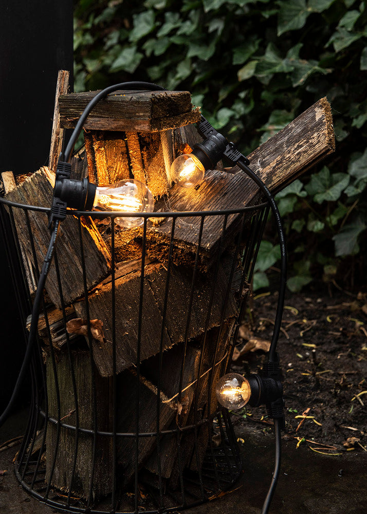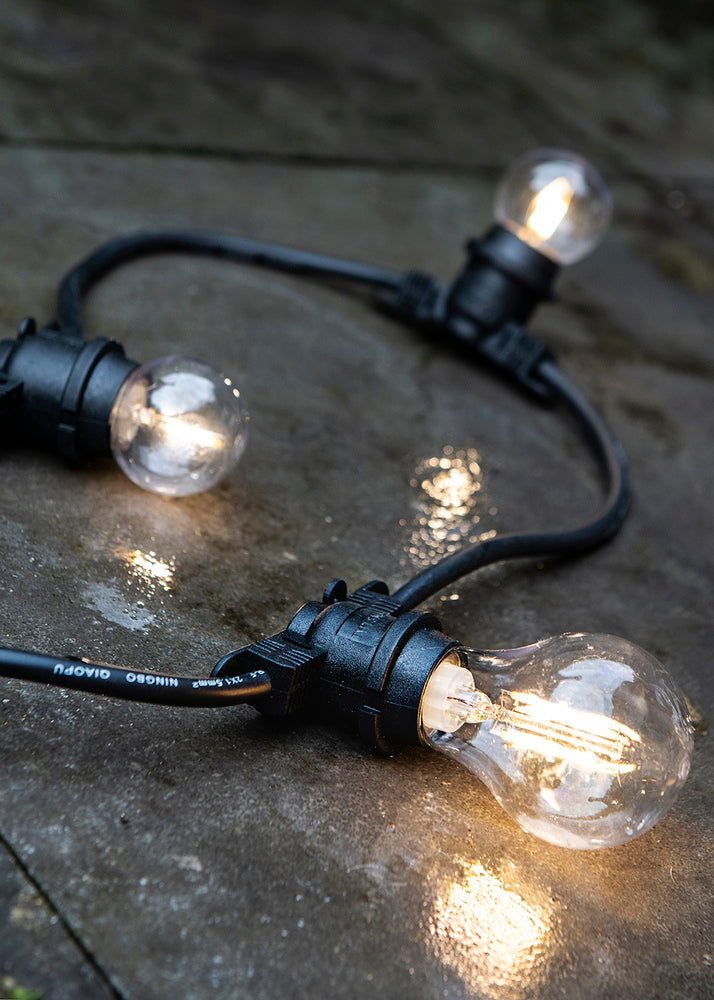 Professional-grade LED filament bulb featuring shatterproof polycarbonate construction, designed for commercial food service environments and outdoor events. Delivers 180 lumens at 2700K warm white, with IP44 rating when properly mounted. Energy-efficient 2W operation replaces traditional 19W bulbs, with 320° light distribution. Ideal for light strings and areas requiring safety compliance.