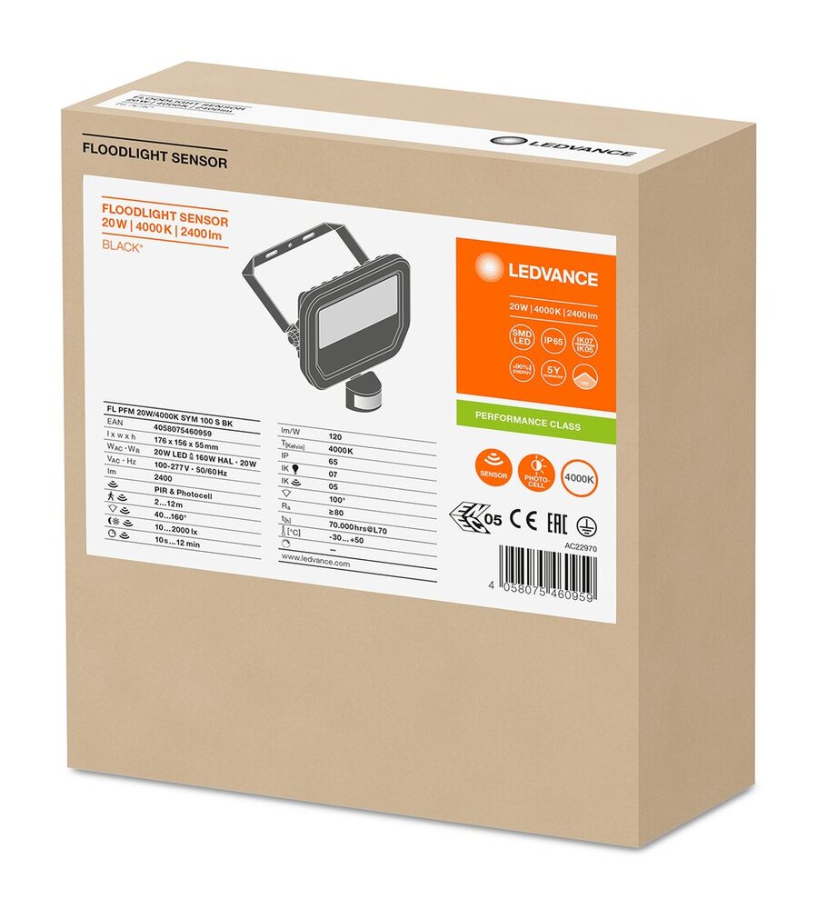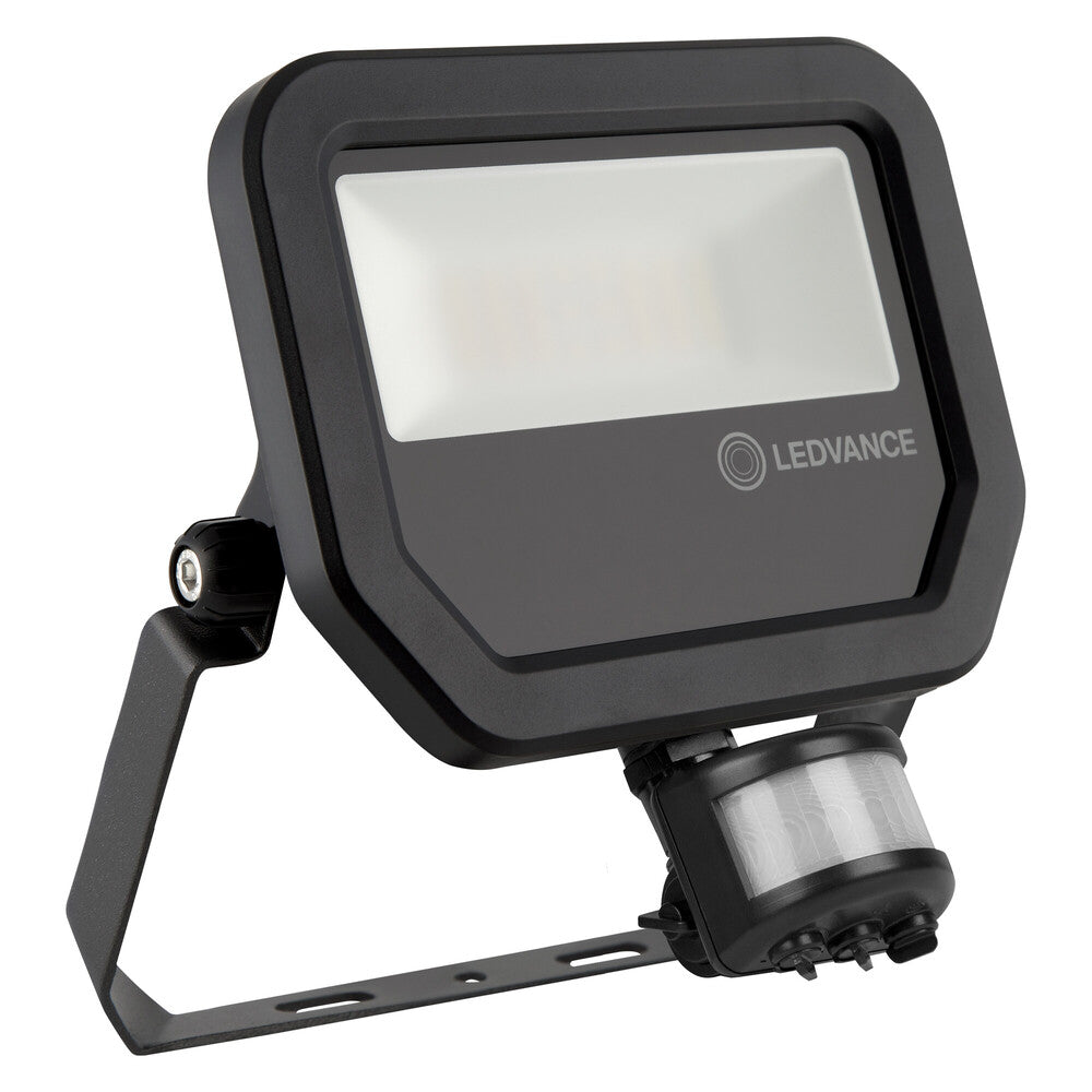 Ledvance Floodlight Sensor downlight/spot/spotlight, subcategory floodlight, luminous flux 2400lm, effective luminous flux according to IEC 2400lm, temperature 4000K, light color white, suitable for lamp power 20W, system power 20W, housing black, degree of protection (IP) IP65, with motion sensor.