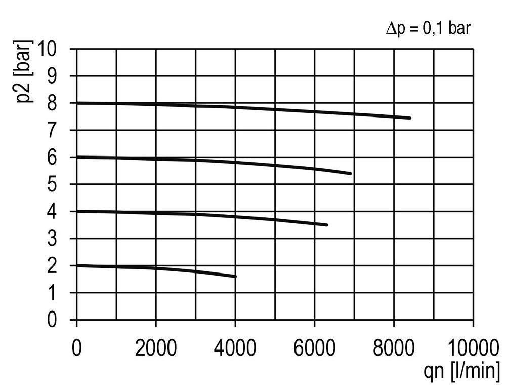 The filter removes water, dirt and other harmful particles larger than 0.01 microns. The filter removes water, dirt and other harmful particles for your air system. This model has G 1 inch ports. The maximum flow rate is 1500 l/min. Please note that the maximum flow rate alone doesn't provide enough information to proper sizing. Use the flow curve to determine if the pressure drop (droop) within your expected flow rate range is acceptable. The flow curve shows the flow rate for a set input pressure with multiple output pressures. For each output pressure, it can be seen how the pressure changes with increasing flow rate. It is recommended to use the device in the flat range of the curve, and not on the beginning or the end of the curve.