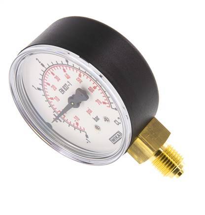 The pressure gauge MW-1563PV is designed for vacuum applications and measures pressures within the range of -1 to 5 bar (-15..73 psi). The gauge has two measurement scales in bar (black) with scale division of 0.2 and in psi (red). The measurement accuracy class is 2.5 (± 2.5 % maximum deviation). The gauge body is made of plastic, the connection and indicator are made of brass. Please make sure that your medium is compatible with brass. The connection point for this manometer is located below the gauge. As a rule of thumb, please select a pressure gauge that has a rating scale of at least 25% higher than the maximum operating pressure.