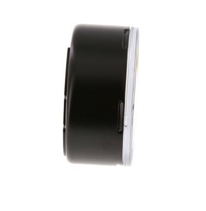 The pressure gauge MW010063SV is designed for gas and liquid media and measures pressures within the range of 0 to 100 bar (0..1450 psi). The gauge has two measurement scales in bar (black) with scale division of 5 and in psi (red). The measurement accuracy class is 1.6 (± 1.6 % maximum deviation). The gauge body is made of steel, the connection and indicator are made of brass. Please make sure that your medium is compatible with brass. The connection point for this manometer is located below the gauge. As a rule of thumb, please select a pressure gauge that has a rating scale of at least 25% higher than the maximum operating pressure.