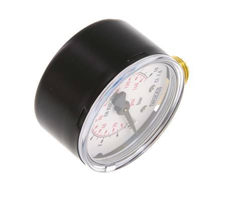 The pressure gauge MW01050SV is designed for gas and liquid media and measures pressures within the range of 0 to 10 bar (0..145 psi). The gauge has two measurement scales in bar (black) with scale division of 0.5 and in psi (red). The measurement accuracy class is 1.6 (± 1.6 % maximum deviation). The gauge body is made of steel, the connection and indicator are made of brass. Please make sure that your medium is compatible with brass. The connection point for this manometer is located below the gauge. As a rule of thumb, please select a pressure gauge that has a rating scale of at least 25% higher than the maximum operating pressure.