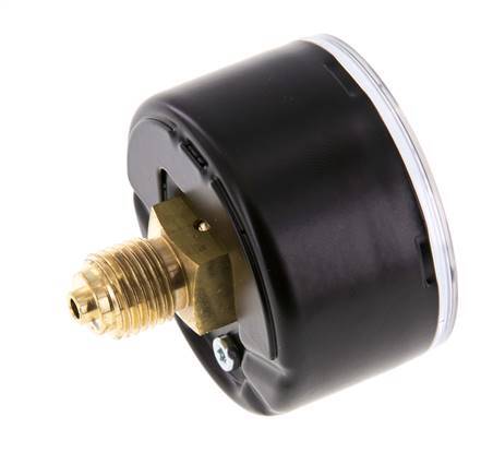 The pressure gauge MW0150SH is designed for gas and liquid media and measures pressures within the range of 0 to 1 bar (0..15 psi). The gauge has two measurement scales in bar (black) with scale division of 0.05 and in psi (red). The measurement accuracy class is 1.6 (± 1.6 % maximum deviation). The gauge body is made of steel, the connection and indicator are made of brass. Please make sure that your medium is compatible with brass. The connection point for this manometer is located rear the gauge. As a rule of thumb, please select a pressure gauge that has a rating scale of at least 25% higher than the maximum operating pressure.