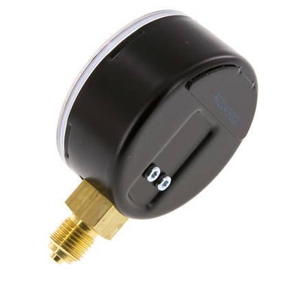 The pressure gauge MW04063SV is designed for gas and liquid media and measures pressures within the range of 0 to 40 bar (0..580 psi). The gauge has two measurement scales in bar (black) with scale division of 2 and in psi (red). The measurement accuracy class is 1.6 (± 1.6 % maximum deviation). The gauge body is made of steel, the connection and indicator are made of brass. Please make sure that your medium is compatible with brass. The connection point for this manometer is located below the gauge. As a rule of thumb, please select a pressure gauge that has a rating scale of at least 25% higher than the maximum operating pressure.