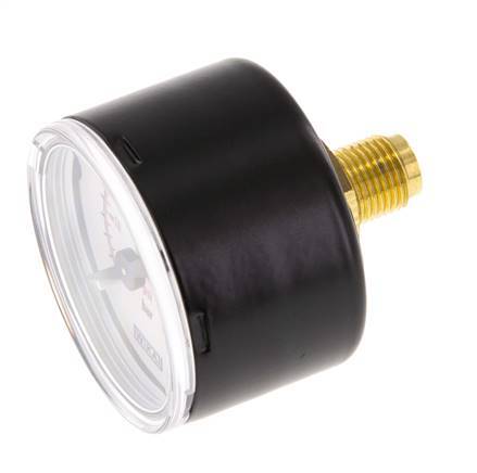 The pressure gauge MW0440SH-18 is designed for gas and liquid media and measures pressures within the range of 0 to 4 bar (0..58 psi). The gauge has two measurement scales in bar (black) with scale division of 0.2 and in psi (red). The measurement accuracy class is 1.6 (± 1.6 % maximum deviation). The gauge body is made of steel, the connection and indicator are made of brass. Please make sure that your medium is compatible with brass. The connection point for this manometer is located rear the gauge. As a rule of thumb, please select a pressure gauge that has a rating scale of at least 25% higher than the maximum operating pressure.