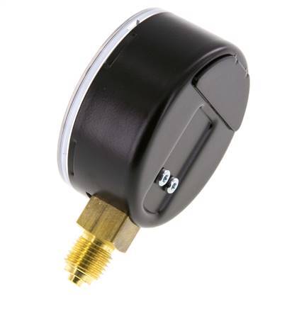 The pressure gauge MW0663SV is designed for gas and liquid media and measures pressures within the range of 0 to 6 bar (0..87 psi). The gauge has two measurement scales in bar (black) with scale division of 0.2 and in psi (red). The measurement accuracy class is 1.6 (± 1.6 % maximum deviation). The gauge body is made of steel, the connection and indicator are made of brass. Please make sure that your medium is compatible with brass. The connection point for this manometer is located below the gauge. As a rule of thumb, please select a pressure gauge that has a rating scale of at least 25% higher than the maximum operating pressure.