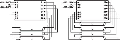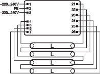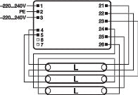 Electronic Control Gear (ECG) designed for 26mm fluorescent lamps operating at 220-240V AC power supply. Features optimized filament preheating, automatic defective lamp shutdown, and end-of-life protection. Operates at 50/60 Hz with line voltage range 198-264V. Achieves A2 Energy Efficiency Index rating through innovative cut-off technology.