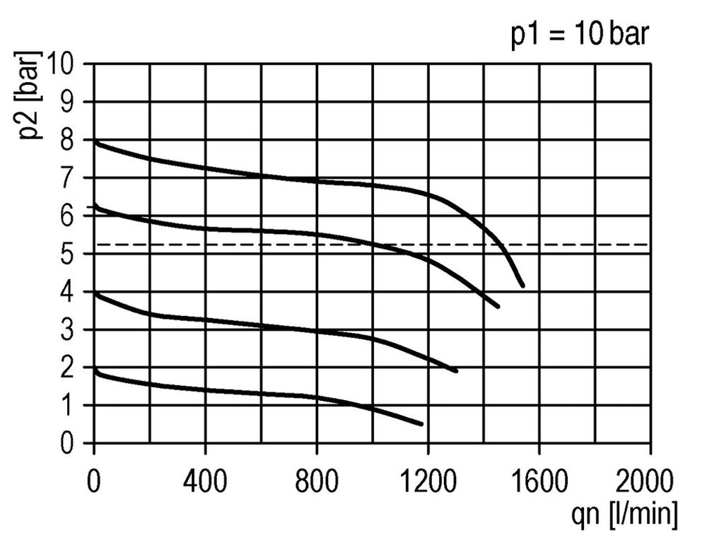 The pressure regulator adjusts the pressure continuously to a stable level, even when the input pressure varies. The level can be adjusted between 0.5 to 10.0 bar (7 to 145 psi). This model has G 1/4 inch ports. The maximum flow rate is 1000 l/min. Please note that the maximum flow rate alone doesn't provide enough information to proper sizing. Use the flow curve to determine if the pressure drop (droop) within your expected flow rate range is acceptable. The flow curve shows the flow rate for a set input pressure with multiple output pressures. For each output pressure, it can be seen how the pressure changes with increasing flow rate. It is recommended to use the device in the flat range of the curve, and not on the beginning or the end of the curve. Note that the pressure regulator controls the output pressure, not the flow rate. The output pressure can be adjusted by pulling the hand wheel up and twisting.