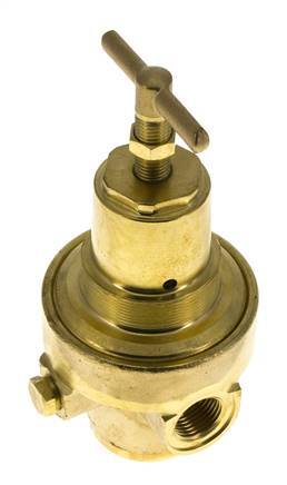 The maximum input pressure is 30.0 bar (435 psi) and the temperature range is between -20 and 80 °C (-4 and 176 °F). There is a built-in pressure relief valve on the outlet side when the set pressure is exceeded. The housing material is made out of brass.