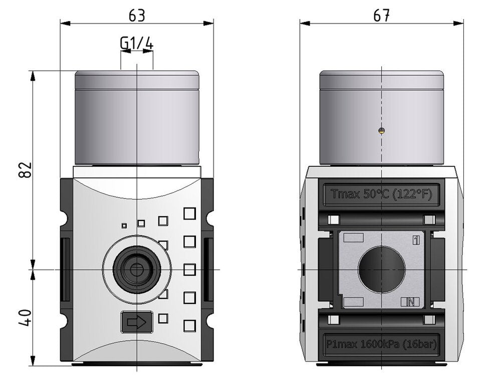 The maximum input pressure is 16.0 bar (232 psi) and the temperature range is between -10 and 50 °C (14 and 122 °F). There is a built-in pressure relief valve on the outlet side when the set pressure is exceeded. The housing material is made out of PA 66. A remote pressure regulator is used for hard-to-reach locations. The setting pressure is controlled by a separate pressure regulator in an accessible location through an air line.