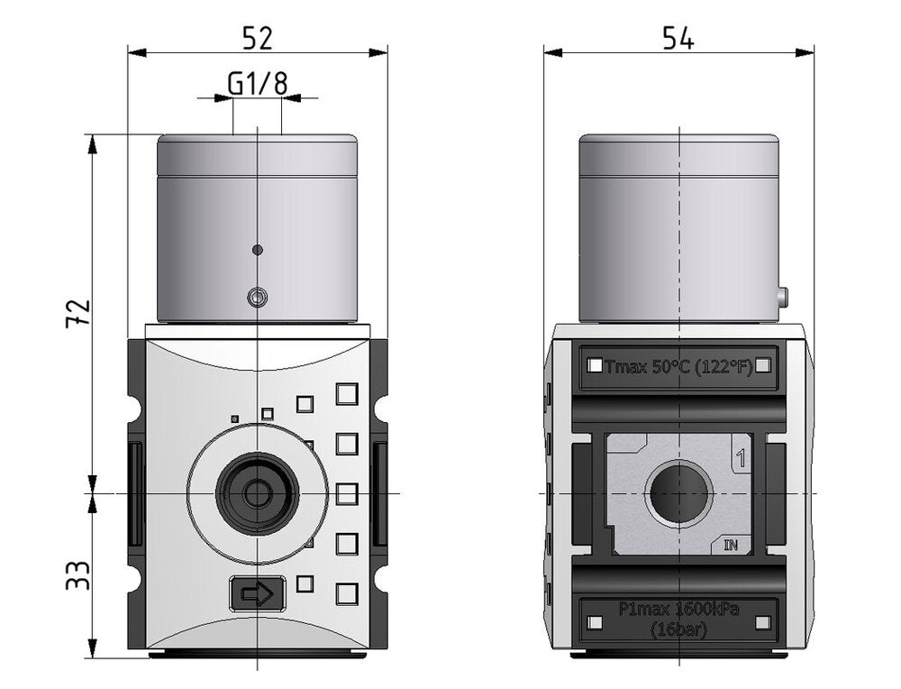 The maximum input pressure is 16.0 bar (232 psi) and the temperature range is between -10 and 50 °C (14 and 122 °F). There is a built-in pressure relief valve on the outlet side when the set pressure is exceeded. The housing material is made out of PA 66. A remote pressure regulator is used for hard-to-reach locations. The setting pressure is controlled by a separate pressure regulator in an accessible location through an air line.