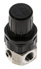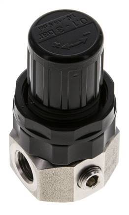 The pressure regulator adjusts the pressure continuously to a stable level, even when the input pressure varies. The level can be adjusted between 0.5 to 3.0 bar (7 to 44 psi). This model has G 1/4 inch ports. The maximum flow rate is 320 l/min. It is recommended to select a filter with a maximum flow rate 1.5 to 2 times higher than the maximum flow rate in your system to avoid excessive pressure drop. Additionally, keep in mind that lower input pressures may reduce the achievable maximum flow rate, so ensure your system pressure is sufficient for optimal performance. Note that the pressure regulator controls the output pressure, not the flow rate. The output pressure can be adjusted by pulling the hand wheel up and twisting.