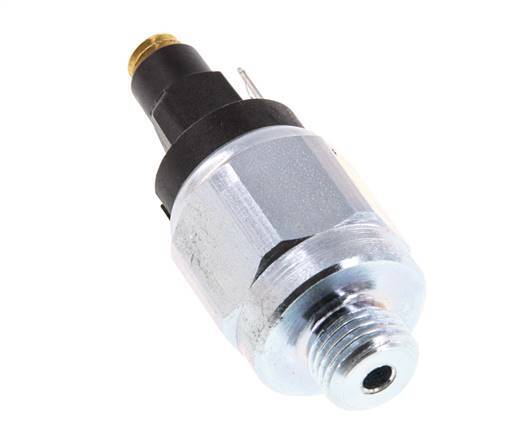 This is a mechanical pressure switch with normally closed (NC, SPST (single pole, single throw)) contacts. If the application pressure greater than setpoint pressure the contacts open the circuit. The setpoint is the pressure value where the switch activates and the reset point is the value at which the switch deactivates when the pressure decreases. The setpoint can be adjusted between 1 and 10 bar (15 and 145 psi). The maximum overpressure is 20 bar (290 psi). It has a switch hysteresis (the difference between setpoint and reset point) of 15 - 20%. The switching capacity for this pressure switch is 5 A @ 42 V AC or 5 A @ 30 V DC. It can be connected to an electrical network with a flat connector. This pressure switch is made in a diaphragm design with a steel body and an NBR seal. It is suitable for various media, such as compressed air, hydraulic oil and in a temperature range from -25 to 85°C (from -13 to 185°F). The connection port has a size of G 1/4 inch with male threads. The pressure switch has an IP65 rating.