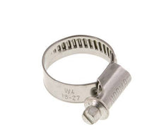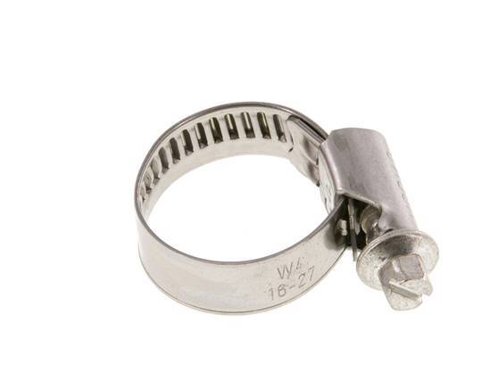 Norma hose clamp with an adjustable range of 16 - 27 mm. It has a band width of 12 mm. This hose clamp is made according to DIN 3017-1 standard. The housing material is stainless steel 304. The hose clamp is tightened or loosened by using a screwdriver due to the worm gear design.