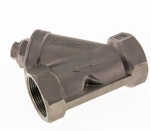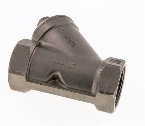 Stainless steel Y-strainer with G 1 1/2 inch female threads and a stainless steel mesh with a 1 mm filter size. For media up to 40 bar (580 psi) at temperatures between -20 °C and 200 °C (-4 to 392 °F). To be used in a single flow direction (see arrow on housing). The residue collects in the filter and can be cleaned by unscrewing the sealing cap.