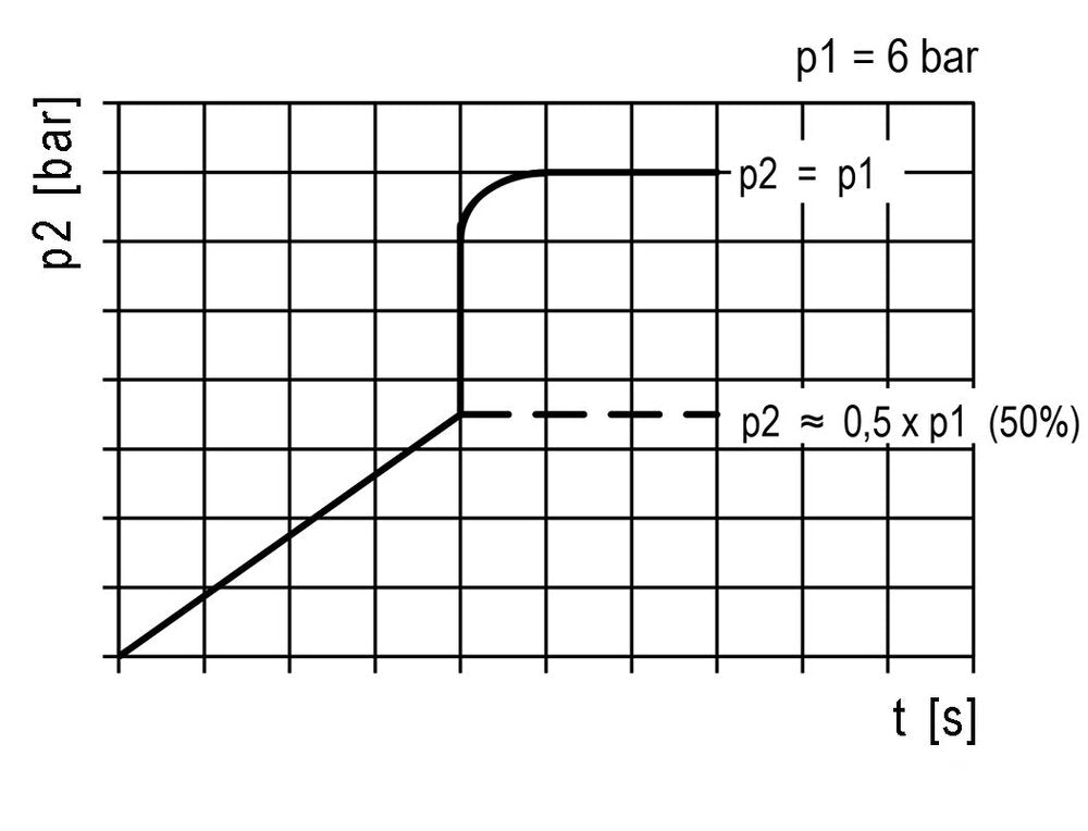 This soft-start valve provides a controlled increase of downstream pressure at startup and can be dumped when needed to exhaust the system pressure quickly. At a pressure of approximately 50% of the input pressure, the start-up valve switches over to maximum throughway. Pressure build-up can be slowed down or sped up using an adjustment screw. A soft start is necessary if cylinders moving too quickly can cause entrapment or damage during machine startup. The valve has G 3/4 inch ports and the maximum flow rate is 10000 l/min. The input pressure range is from 2 to 16 bar (29.0 to 232.0 psi). A shut-off valve must be installed before a start-up valve.