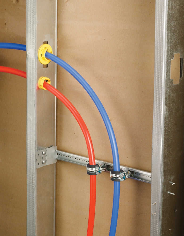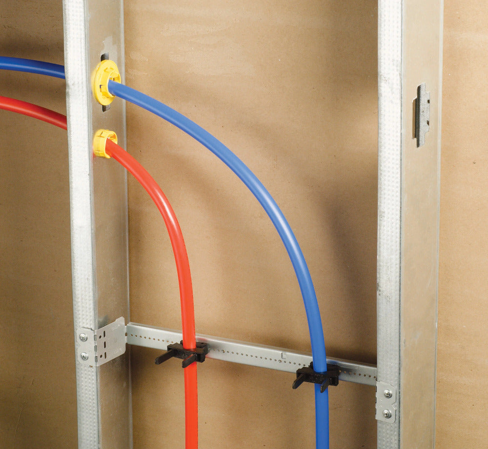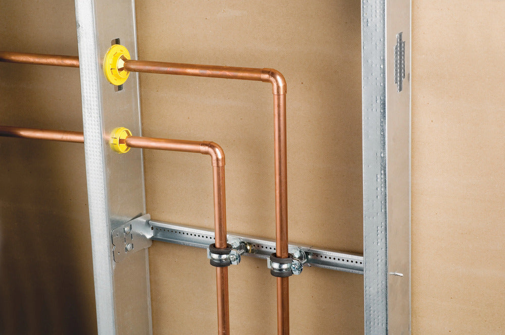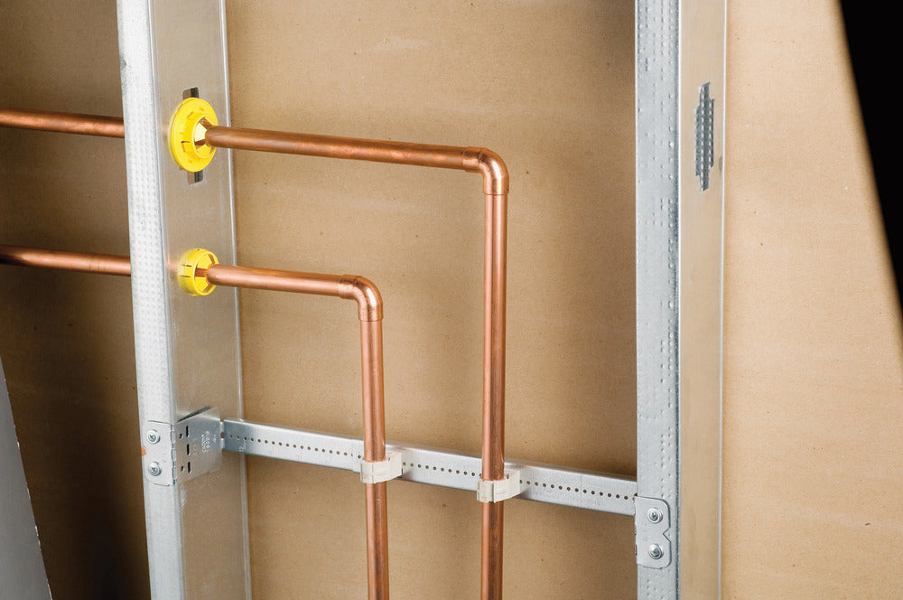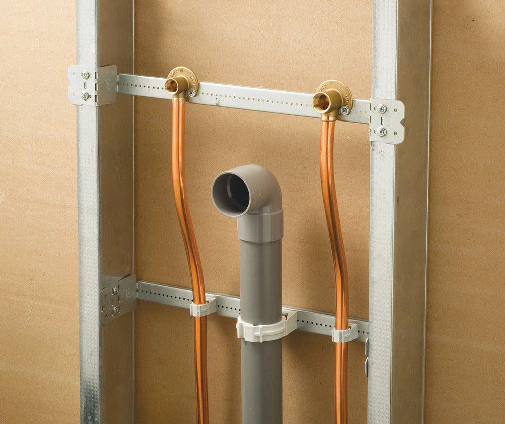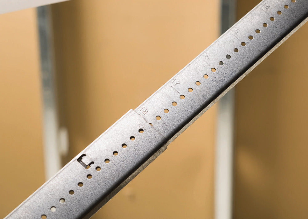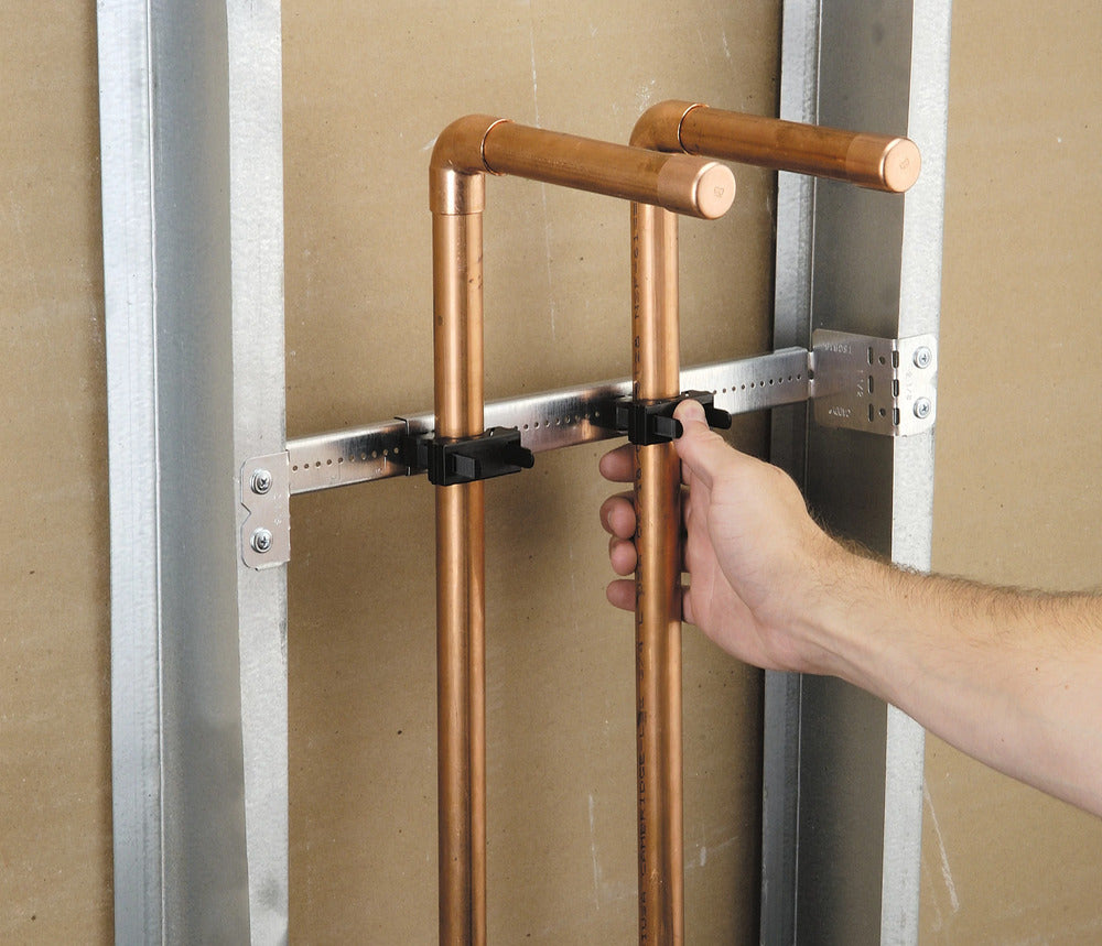 Professional-grade telescoping bracket designed for mounting electrical boxes and conduits between wall studs. Features stamped inch markings and pilot holes for precise installation. Adjustable from 432mm to 660mm (17" to 26") to accommodate non-standard stud spacing. Supports multiple box or conduit mounting configurations for efficient installation in drywall construction.