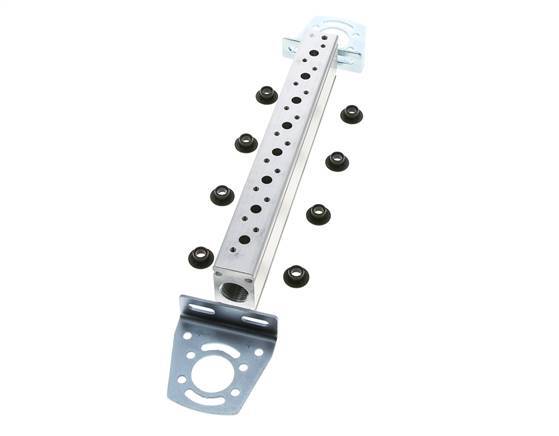 Strong and lightweight manifold for up to 8 pneumatic solenoid valves from the Festo VUVS LK20 series. Includes rubber seals and bolts to mount the valves. Unused stations can be closed by blocking plates (separately available). The in- and outlet ports have G 3/8 inch threads on both sides of the manifold. This manifold is an efficient way to reduce tubing, fittings and fixtures, but also to simplify installation and maintenance. With screws and seals.