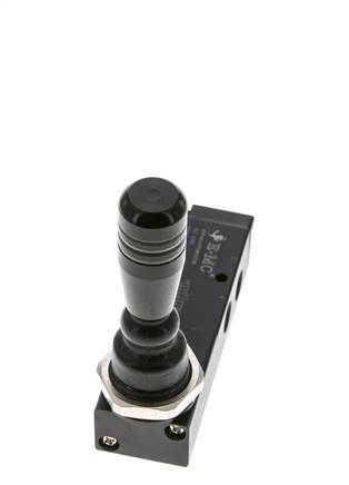 If you need to release air pressure when an application stops, choose a 5/3-way valve with an exhaust center. Due to the exhaust center, these valves block air from being trapped in cylinders when stopped. As an example, if clamped material needs to be removed manually, the valve needs to relieve air pressure when it is off. A pneumatic hand lever valve is used to manually turn on and off an air supply. In a pneumatic system, they can control cylinders and signal other equipment.