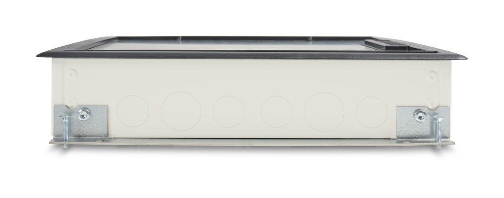 Professional-grade power distribution box featuring 4 230V power outlets and 8 RJ45 network connection points. Includes a protective cover with 4mm installation depth and plastic mounting edge for secure installation and reliable operation.