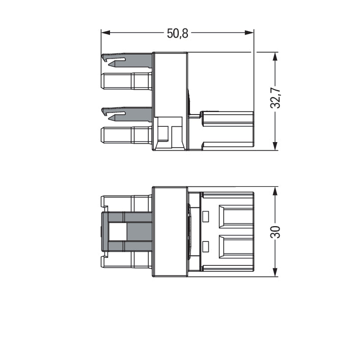 Professional 3-pole distribution connector featuring one input and two outputs positioned on a single side. Equipped with dual locking levers for secure connections. Designed for building installations with dimensions of 51x32.7x30mm. Rated for 250V nominal voltage and 25A current capacity with IP20 protection rating.