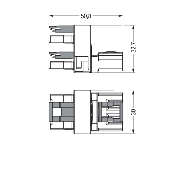 Professional 3-pole H-distribution connector featuring 1 input and 2 outputs on one side. Equipped with 3 locking levers for flying leads configuration. Operates at 250V AC/DC with 25A nominal current. Temperature range: -5°C to +40°C. Constructed with UL 94 V-0 rated polyamide housing with 10mm pitch.