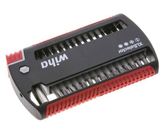 This is a high-quality 31-piece Wiha bit set. The set consists of a magnetic bit holder, 3 slotted bits in sizes: 4.5, 5.5 and 6.5 mm, 7 Phillips cross bits in sizes: 2xPH1, 4xPH2 and PH3, 8 Pozidriv cross bits in sizes: 2xPZ1, 5xPZ2 and PZ3, and 12 TORX screw bits in sizes: 2xTX10, 2xTX15, 2xTX20, 3xTX25, 2xTX30 and TX40.